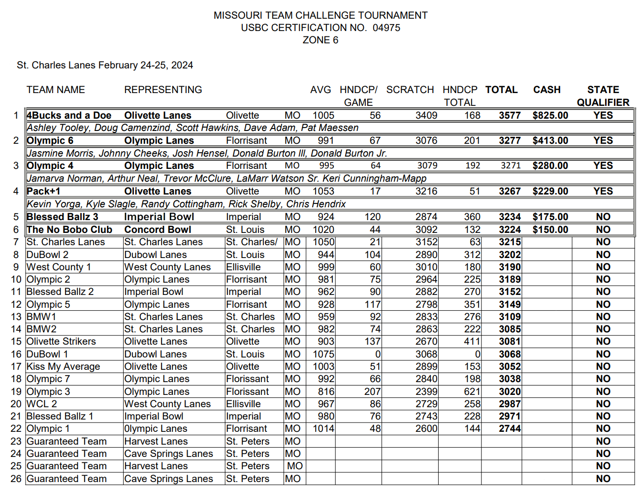 than once. Teams may cash only once with the same 5 bowlers. Teams